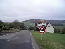 Those limits are not systematically signaled as they are the default limit. For instance the name of a town or village at its entry is an implicit limitation to 50 km/h; the crossed name at the exit is the corresponding end of limit. This matches the way 1968 Vienna Convention on Road Traffic defined a built-up area (in English, or agglomération in French). However, additional 50 km/h speed limit signs, or other speed limit sign, might be added to make it more explicit.