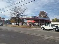 As self-service gasoline became legalized in many states, in 1976 Marathon decided to use "Speedway" (without the "79", as 87 octane had become the standard at this point) at higher-volume self-service stations with convenience stores. Some of the first were converted from Oshkosh, Wisconsin-based Consolidated Stores, which at the time had locations in Wisconsin and Michigan. These stores were converted to the Speedway name throughout the 1970s and 1980s after Marathon acquired Consolidated.[9] The concept turned out to be one of the few bright spots for Marathon during this time due to the 1970s energy crisis, and the company quickly expanded this concept across Marathon's main territories across the Midwest and Southeastern United States. Part of this expansion was through the acquisition of various other smaller regional gasoline station chains, including GasAmerica, Starvin' Marvin, Gastown, Wake Up, Bonded, United, Cheker, Port, Ecol, and Value. These stations were converted to the Speedway branding. Stations acquired in the Cheker deal included former Enco stations that Cheker acquired after they were sold off by Exxon in 1977.[10] Legally, Marathon's convenience store business was known as Emro Marketing Company during this period,[11] getting its name from placing an "E" in front of Marathon Oil's ticker symbol, MRO. Speedway adopted its current logo, known as the "Moving S", in 1982.