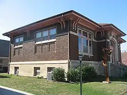 The old Spencer Public Library is a former public library and historic Carnegie library located at Spencer, Owen County, Indiana. It was built in 1912, and is a one-story, three bay, American Craftsman style brick building on a raised basement. It has a low-pitched hipped roof and projecting entry bay. It was constructed with a $10,000 grant provided by the Carnegie Foundation.[2]: 5
