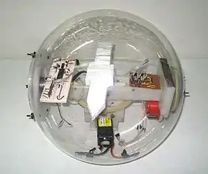 A Spherical Robot, also known as spherical mobile robot, or ball-shaped robot is a mobile robot with spherical external shape.[1] A spherical robot is typically made of a spherical shell serving as the body of the robot and an internal driving unit (IDU) that enables the robot to move.[2] Spherical mobile robots typically move by rolling over surfaces. The rolling motion is commonly performed by changing the robot's center of mass (i.e., pendulum-driven system), but there exist some other driving mechanisms.[3][4] In a wider sense, however, the term "spherical robot" may also be referred to a stationary robot with two rotary joints and one prismatic joint which forms a spherical coordinate system (e.g., Stanford arm[5]).
