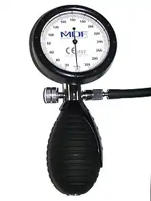 A sphygmomanometer (/ˌsfɪɡmoʊməˈnɒmɪtər/ SFIG-moh-mə-NO-mi-tər), a.k.a. a blood pressure monitor, or blood pressure gauge, is a device used to measure blood pressure, composed of an inflatable cuff to collapse and then release the artery under the cuff in a controlled manner,[1] and a mercury or aneroid manometer to measure the pressure. Manual sphygmomanometers are used with a stethoscope when using the auscultatory technique.