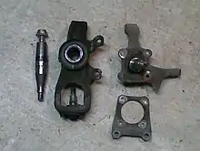 Spindles are carried by steering knuckles or "uprights".[1] Although the terms "steering knuckle" and "upright" are sometimes used interchangeably with "spindle", they all refer to different parts.[2]