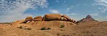 The Spitzkoppe (from German for "pointed dome"; also referred to as Spitzkop, Groot Spitzkop, or the "Matterhorn of Namibia") is a group of bald granite peaks or inselbergs located between Usakos and Swakopmund in the Namib desert of Namibia. The granite is more than 120 million years old and the highest outcrop rises about 1,728 metres (5,669 ft) above sea level. The peaks stand out dramatically from the flat surrounding plains. The highest peak is about 670 m (2,200 ft) above the floor of the desert below. A minor peak – the Little Spitzkoppe – lies nearby at an elevation of 1,557 m (5,108 ft). Other prominences stretch out into a range known as the Pontok Mountains.[1]