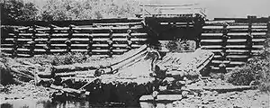 The splash dam was equipped with a chute to allow water and logs to escape. When the chute was closed, water collected behind the dam. Construction work also extended to the stream below the splash dam, which had to be cleared of obstacles and often had its banks cleared for some distance above the waterline. This was an effort to prevent as many logs as possible from becoming stuck on the banks of the creek.[2] The Pennsylvania General Assembly passed a law on March 28, 1871 allowing splash dam construction and clearing of creeks to allow loose logs to float better.[3]