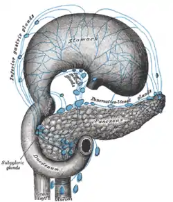 | Drains to | celiac lymph nodes |