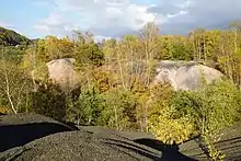 The oldest coal-based spoil tips may still contain enough coal to begin spontaneous slow combustion. This results in a form of vitrification of the shale, which then acquires sufficient mechanical strength to be of use in road construction.[16] Some can therefore have a new life in being thus exploited; for example, the flattened pile of residue from the 11/19 site of Loos-en-Gohelle. Conversely, others are painstakingly preserved on account of their ecological wealth. With the passage of time, they become colonised with a variety of flora and fauna, sometimes foreign to the region. This diversity follows the mining exploitation. In South Wales some spoil tips are protected as Sites of Special Scientific Interest because they provide a unique habitat for 57 species of Lichen, several of which are at risk due to their limited environment being developed and by vegetation development.[17]