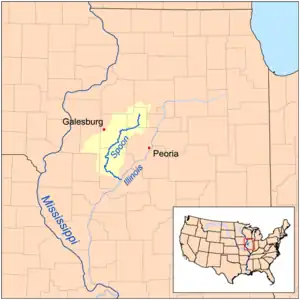 The Spoon River is a 147-mile-long (237 km)[2] tributary of the Illinois River in west-central Illinois in the United States. The river drains largely agricultural prairie country between Peoria and Galesburg. The river is noted for giving its name to the fictional Illinois town in the 1915 poetry work Spoon River Anthology by Edgar Lee Masters, who was from Lewistown, which is near the river.