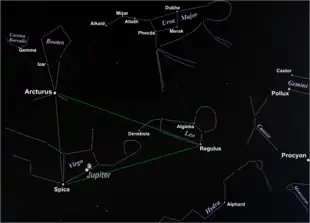 The Spring Triangle is an astronomical asterism involving an imaginary triangle drawn upon the celestial sphere, with its defining vertices at Arcturus, Spica, and Regulus.[1] This triangle connects the constellations of Boötes, Virgo, and Leo. It is visible rising in the south eastern sky of the northern hemisphere between March and May.