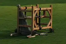 A springald, or espringal, was a medieval torsion artillery device for throwing bolts. It is depicted in a diagram in an 11th-century Byzantine manuscript, but in Western Europe is more evident in the late 12th century and early 13th century. It was constructed on the same principles as an Ancient Greek or Roman ballista, but with inward swinging arms and threw bolts instead of stones. It was also known as a 'skein-bow', and was a torsion device using twisted skeins of silk or sinew to power two bow-arms.[1]
