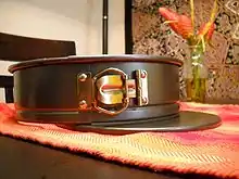 A springform pan is a type of bakeware that features sides that can be removed from the base. Springform refers to the construction style of this pan. The base and the sides are separate pieces that are held together when the base is aligned with a groove that rings the bottom of the walls. The pan is then secured by a latch on the exterior of the wall. This tightens the 'belt' that becomes the walls of the pan and secures the base into the groove at the base of the walls.