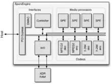 The SpursEngine is a stream processor powered by four Synergistic Processing Elements (SPE),[2] also used in the Cell processor featured in Sony PlayStation 3. These processing elements are fed by on chip H.264 and MPEG-2 codecs and controlled by an off die host CPU, connected by an on chip PCIe controller[2] (in contrast to the Cell processor which has an on chip CPU (the PPE) doing similar work). To enable smoother interaction between the host and the SpursEngine Toshiba also integrated a simple proprietary 32-bit control core. The SpursEngine employs dedicated XDR DRAM as its working memory.[2]