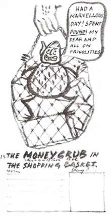 To meet this need, Boydell produced a series of six sketches depicting an imp-like creature named the 'Money Grub' that could 'push, pull, scratch, bite and steal'.[2] The concept was accepted almost as it stood, aside from the name being changed.
