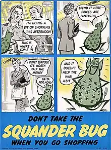 The Squander Bug was a World War II propaganda character created by the British National Savings Committee to discourage wasteful spending and consumption. Originally designed by freelance illustrator Phillip Boydell for press adverts, the character was widely used by other wartime artists in poster campaigns and political cartoons. It is one of the few propaganda campaigns from World War II to be fully documented from the original concept sketches to the finished adverts.[1]