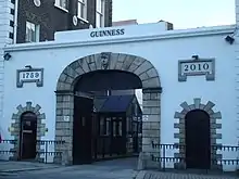St. James's Gate, located off the south quays of Dublin, on James's Street, was the western entrance to the city during the Middle Ages. During this time the gate was the traditional starting point for the Camino pilgrimage from Dublin to Santiago de Compostela in Galicia (Spain).[1] Though the original medieval gate was demolished in 1734,[2] the gate gave its name to the area in which it was located,[3] and in particular to the St. James's Gate Brewery (which was taken over by Arthur Guinness in 1759).[2]