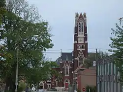 The church building is a large Gothic Revival structure covered in red brick. It was designed by New York City architect William Shickel.[3] At one time the central bell tower featured a stone tracery spire. It was removed in the 1960s.[5]