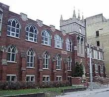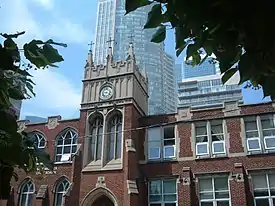 St. Michael's Choir School is located next to St. Michael's Cathedral Basilica and operates out of four buildings at 56, 66, 67 and 69 Bond Street. In 2016, the school's secondary school building, located at 69 Bond Street, was rated as in need of "critical" repairs and had the worst-performing score among Toronto Catholic District School Board secondary schools on the Ontario Ministry of Education's Facility Condition Index.[103] In 2018, the Ministry of Education announced it would spend $11.2 million CAD[104][105][106] to construct a new consolidated school building at 67 Bond Street designed by KPMB Architects.[107][108][109] In 2022, KPMB Architects, the Archdiocese of Toronto, and the Toronto Catholic District School Board submitted a new development plan to the City of Toronto for a revised six-storey school design that incorporates and restores the historic Gothic revival-style façade at 66 Bond Street.[110][111]