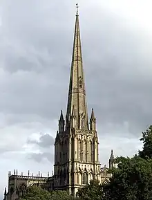 Whilst the spire is very large, the church is not the third tallest parish church in England. It ranks as the 15th-tallest church in the United Kingdom, and the 6th-tallest parish church, surpassed in the respect of the latter by the churches of St Walburge in Preston, St James in Louth, St Wulfram in Grantham, St Elphin in Warrington and St Mary Abbots in Kensington. It is also the second tallest church in South West England, surpassed only by Salisbury Cathedral.[6]