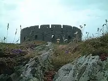 St Michael's Isle (Manx: Ellan Noo Mael or Ynnys Vaayl), more commonly referred to as Fort Island, is an island in Malew parish in the Isle of Man, noted for its attractive ruins. It covers an area of 5.14 hectares (12.70 acres),[1] is about 400 metres (440 yards) long[2] from west to east, and is connected to the Langness Peninsula, near Derbyhaven, by a narrow causeway. The island itself is made of rocky slate and the soil is very acidic.[1] Nevertheless, it has important communities of maritime plants.[3]