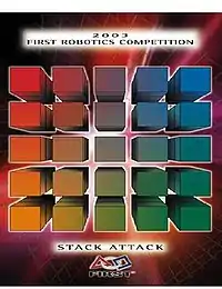 Stack Attack was the game for the 2003 FIRST Robotics Competition. Two teams of two robots compete by moving large Sterilite bins into their zones and arranging them into stacks.