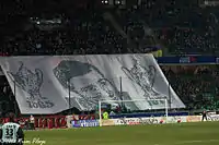 Another major supporter group of the club is the Section Roazhon Pariz. It is a section of the RCK that is situated in Paris. The group supports the team at important away matches, such as those against Lyon and Paris Saint-Germain.[20] The RCK makes no attempt to hide its chaotic and festive appearance. In 2003, a second group of ultras, the Breizh Stourmer ("Breton Warriors") was formed through a break with the RCK. The group was created around the idea of a small, strong core of supporters and chose to situate themselves on the opposite side of the RCK. The Breizh Stourmer has been accused by elements of the RCK for certain members holding extreme-right views.[17] Violent clashes between radical members of the two groups have occurred. The main rival of the RCK has, however, not been the Breizh Stourmer, but for many years, the Brigade Loire, a supporters' group of Rennes' rival club Nantes. The Breizh Stourmer has since dissolved. In 2008, a new group of supporters, the Unvez Kelt (UK) ("Celtic Unity"), was founded. The group was initially refused by the club as an official group, however, with the help of Les Socios, it was finally accepted.[21] Failing to establish itself and after several problems, among them a fire that destroyed its premises in November 2010,[22] clashes with the National Police[23] and incidents resulting in several of its members becoming arrested during an away match at Auxerre in 2012,[24] the Unvez Kelt decided to dissolve in 2012.[25]