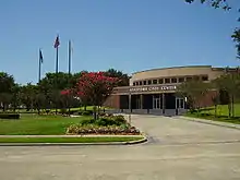 Fort Bend County Libraries' Mamie George Branch is in Sugar Land, on Dulles Avenue next to Dulles Middle School.[52][53] The Mamie George Library, a 4,900 square feet (460 m2) library designed by Wylie W. Vale and Associates, opened in November 1974. It was named after Mamie George, a philanthropist from Fort Bend County. The George Foundation donated funds for the building, and the Fort Bend Independent School District donated the land the library was built on. The library was renovated in 1991. In 1996 the small-business-center materials were moved from the Missouri City Branch to the Mamie George Branch.[54]