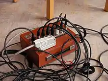 In a live setting, all of the microphones and musical instruments on stage connect to the stage box, which then connects to the mixing console with a single cable.[2] This is usually more practical than running many individual cables between the stage and the mixer, especially for touring systems.[1] Stage boxes are sometimes also used to connect speakers to a mixer – either foldbacks or front-of-house speakers. Some sound engineers connect wireless microphone receivers to the stage box and position them in the same rack next to the stage.[10]