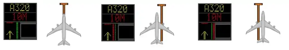Safedock by ADB Safegate, allows aircraft to park up to an accuracy of 10 centimetres (3.9 in) using invisible infrared lasers to attain the aircraft's position and type for easier docking.[4][5] It comes in a variety of models; the X, the T1, the T2 and the T3.[6] Red and yellow arrows indicate in which direction the pilot needs to manoeuvre to be on the centreline. Each model has an S variant (e.g. T1S), which also indicates the position of the aircraft relative to the centreline. In either variant, a central yellow column disappears from bottom to top as the aircraft approaches the stop point.