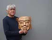 Stanley's grandfather, Mungo Martin is credited with saving and preserving Kwakiutl arts and culture by secretly maintaining potlatch ceremonies during the Canadian potlatch ban which outlawed these social events and the native arts associated with them.[9] The ban lasted from 1885 to 1951. The first legal potlatch after the law was repealed in 1951 was overseen by Martin in Victoria.[9] During the ban Martin carved two totem poles for the Canadian Pavilion at the 1939 New York World's Fair. These were a sensation and contained a subtle message protesting the ban: at the top of the pole, two thunderbirds spread their wings standing on the heads of giant grizzly bears. These are all symbols of strength and are representatives of his family crest. At the bottom of the pole was the emblem of Canada, two beavers.[10] In 1949, the University of British Columbia hired Martin to replicate the poles. While resident carver he built on site his own big house and collected and preserved 400 songs and oral histories. He is credited with the rebirth of an artistic heritage once pronounced dead.[10]