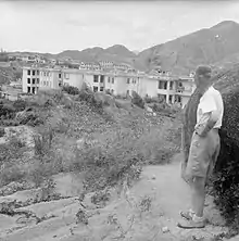 The Stanley site was chosen by the Japanese through consultation with two Hong Kong government officials – Dr. P. S. Selwyn-Clarke, Director of Medical Services, and F. C. Gimson, the Colonial Secretary.[8] Located on Stanley Peninsula, which was about nine kilometres from the city at the time,[9] the camp consisted of St. Stephen's College and the grounds of Stanley Prison, excluding the prison itself; the prison was used by the Japanese authorities to hold what they considered "criminals" from Hong Kong.[10] Several hundred internees lived at St. Stephen's, while the majority of them lived on the prison grounds. Prior to Japanese occupation, St. Stephen's was a secondary school whose facilities, in addition to classrooms, included an assembly hall, bungalows for teachers, and science laboratories. Over twenty internees occupied each bungalow, which was built for one family, and more than that occupied each science laboratory, living between partitions of sacking and old blankets.[2] Almost all the buildings in the camp were used for housing.[11]