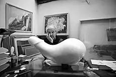 Kubrick married his high-school sweetheart Toba Metz on May 28, 1948. They lived together in a small apartment at 36 West 16th Street, off Sixth Avenue just north of Greenwich Village.[33] During this time, Kubrick began frequenting film screenings at the Museum of Modern Art and New York City cinemas. He was inspired by the complex, fluid camerawork of director Max Ophüls, whose films influenced Kubrick's visual style, and by the director Elia Kazan, whom he described as America's "best director" at that time, with his ability of "performing miracles" with his actors.[34] Friends began to notice Kubrick had become obsessed with the art of filmmaking—one friend, David Vaughan, observed that Kubrick would scrutinize the film at the cinema when it went silent, and would go back to reading his paper when people started talking.[23] He spent many hours reading books on film theory and writing notes. He was particularly inspired by Sergei Eisenstein and Arthur Rothstein, the photographic technical director of Look magazine.[35][lower-alpha 3]