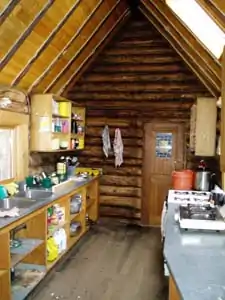 The kitchen is well supplied with dishes, cutlery, utensils, pots and pans and bake ware (including roasting pans, cookie sheets, coffee percolator, bread pans and muffin pans). There is a full size propane oven, as well as some two-burner propane stoves for cooking. Propane is supplied by the Alpine Club via a large outdoor tank. Drinking water is available from a small stream fed by Kiwetinok lake (a day hike) running through the meadow 60 m south of the hut. It is advisable to boil or treat the water before drinking it.[5] In the winter visitors can dig down to the creek or melt snow for water.