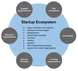 The size and maturity of the startup ecosystem is where a startup is launched and where it grows to have an effect on the volume and success of the startups. The startup ecosystem consists of the individuals (entrepreneurs, venture capitalists, angel investors, mentors, advisors); institutions and organizations (top research universities and institutes, business schools and entrepreneurship programs and centres operated by universities and colleges, non-profit entrepreneurship support organizations, government entrepreneurship programs and services, Chambers of commerce) business incubators and business accelerators and top-performing entrepreneurial firms and startups. A region with all of these elements is considered to be a "strong" startup ecosystem.