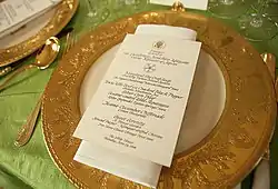 - "The White House State Dinner" (PDF). The White House Historical Association. Archived from the original (PDF) on 14 September 2012. Retrieved 21 July 2009.