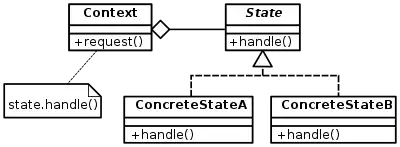 In the accompanying Unified Modeling Language (UML) class diagram, the Context class doesn't implement state-specific behavior directly. Instead, Context refers to the State interface for performing state-specific behavior (state.handle()), which makes Context independent of how state-specific behavior is implemented. The ConcreteStateA and ConcreteStateB classes implement the State interface, that is, implement (encapsulate) the state-specific behavior for each state. The UML sequence diagram shows the run-time interactions: