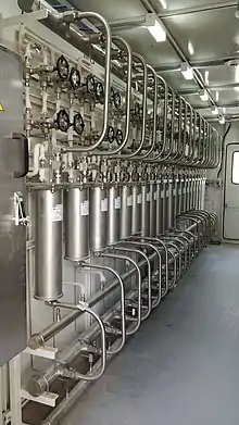 Sample conditioning system in some countries is also called sampling system, Wet Panel or Wet Rack. This is intended to house various components for sample conditioning. This may be an open rack or a closed enclosure with a corridor in between.[4] The system contains sample conditioning equipment and a grab sampling sink. In this system stage, sample is first cooled in Sample Coolers, depressurized in Pressure Regulator[5] and then fed to various analyzers while the flow characteristics is kept constant by means of Back Pressure Regulator.