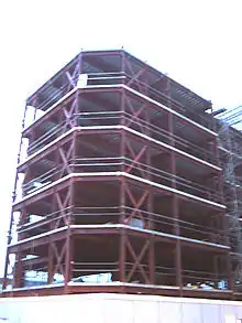 Steel frame is a building technique with a "skeleton frame" of vertical steel columns and horizontal I-beams, constructed in a rectangular grid to support the floors, roof and walls of a building which are all attached to the frame. The development of this technique made the construction of the skyscraper possible. [1]