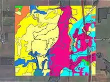 The Straight River rises in Freeborn County and flows northward through the central part of Steele County, continuing into Rice County on the north. The South Branch of the Middle Fork of the Zumbro River rises in Steele County and flows eastward into Dodge County. The county terrain consists of low rolling hills, etched with drainages, completely devoted to agriculture where possible.[5] The terrain slopes to the east and north, with its highest point near the midpoint of its south border, at 1,293 ft (394 m) ASL.[6] The county has an area of 432 square miles (1,120 km2), of which 430 square miles (1,100 km2) is land and 2.7 square miles (7.0 km2) (0.6%) is water.[7]