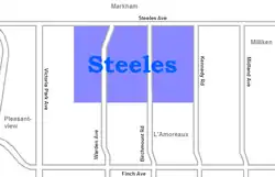Steeles is a suburban neighbourhood in Toronto, Ontario, Canada. Steeles is located in the north-eastern part of Toronto in the former suburb of Scarborough. To the north is bordered by Steeles Avenue East, to the east by Kennedy Road, to the south by a hydro-electric transmission line (just south of McNicoll Avenue) and to the west by Victoria Park Avenue.