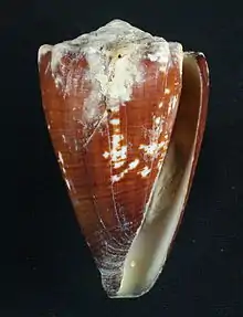 Apertural view of shell of Conus brunneus (Wood, 1828), with operculum, measuring 61.7 mm in height, collected at Sayrilita, Mexico