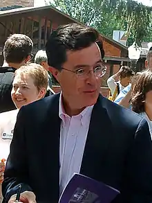 Since 2012, Colbert has collaborated with the Montclair Film Festival, of which his wife is a founder and current president of its board.[152][153] Every year since its foundation, Colbert has participated by hosting an annual fundraising event and leading Q&As and conversations with directors, writers, journalists, and actors such as: Jon Stewart, Rob Reiner, Steve Carell, J. J. Abrams, David Itzkoff, Ethan Hawke, Rachel Weisz, and Meryl Streep.[154][155] He is also part of the Montclair Film advisory board.[156]