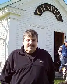 ![]() Stephen Huneck in front of his Dog Chapel in St. Johnsbury, Vermont | |