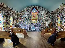 The walls of the chapel are covered with notes of remembrance and pictures of visitors' deceased pets.[19] Outside the chapel is a sign reading "Welcome All Creeds All Breeds No Dogmas Allowed."[3] Friends of Dog Mountain describes the chapel as Huneck's "greatest and most personal artistic contribution" as well as "a living piece of communal art and history, ever evolving with each new note and photo pinned to the memorial walls."[18]