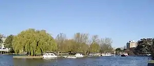 River traffic is directed to the Middlesex side because of posts and mooring on the Surrey side (east here).[6] The island is the base of the Small Boat Club (SBC), a not-for-profit motorboats club formed in 1953 run by the members for the members, using its carved out basin in the north and reinforced moorings on all sides.[2] The SBC has leased the island from the Thames Conservancy (now the Environment Agency) since 1960, giving only Small Boat Club members the right to permanent mooring on the island. Kingston Council granted the SBC permission to erect and have exclusive rights a jetty on the Surrey bank towpath, operational since May 1984.[7]