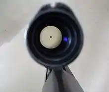 The AUG has a 1.5× telescopic sight that is integrated with the receiver casting and is made by Swarovski Optik. It contains a simple black ring reticle. The sight cannot be set to a specific range but can be adjusted for windage and elevation for an initial zero and is designed to be calibrated for 300 m. It also has a backup iron sight with a rear notch and front blade, cast into the top of the aluminium optical sight housing, in case of failure or damage to the primary optical sight. The sight is also equipped with a set of three illuminated dots (one on the front blade and two at the rear) for use in low-level lighting conditions. In order to mount a wide range of optics and accessories, a receiver with a NATO-standard Picatinny rail and detachable carrying handle was also developed and introduced in December 1997.[9]