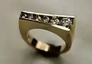 A channel setting is a method whereby stones are suspended between two bars or strips of metal, called channels. Typically, a line of small stones set between two bars is called a channel setting, and a design where the bars cross the stones is called a bar set. The channel is a variation of a "U" shape, with two sides and a bottom. The sides are made slightly narrower than the width of the stone or stones to be set, and then, using the same burs as in prong setting, a small notch, called a bearing, is cut into each wall. The stone is put in place in those notches, and the metal on top is pushed down, tightening the stone in place. The proper way to set a channel is to cut a notch for each stone, but for cheaper production work sometimes a groove is cut along each channel. Since the metal can be very stiff and strong, a reciprocating hammer, similar to a jackhammer but jewelry sized, may be used to hammer down the metal, as it can be difficult to do by hand. The metal is then filed down and finished, and the inner edge near the stones cleaned up and straightened as necessary. As with all jewelry, there can be many variations of channel work. At times the walls will be raised—sometimes a center stone will be set between two bars that rise high from the base ring—or the channel may be cut directly into the surface, making the stones flush with the metal.