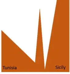 The Strait of Sicily (also known as Sicilian Strait, Sicilian Channel, Channel of Sicily, Sicilian Narrows and Pantelleria Channel; Italian: Canale di Sicilia or the Stretto di Sicilia; Sicilian: Canali di Sicilia or Strittu di Sicilia, Arabic: مضيق صقلية Maḍīq Ṣiqillīyah or مضيق الوطن القبلي Maḍīq al-Waṭan al-Qiblī) is the strait between Sicily and Tunisia.[1][2] The strait is about 145 kilometres (90 mi) wide and divides the Tyrrhenian Sea and the western Mediterranean Sea, from the eastern Mediterranean Sea. The maximum depth is 316 meters (1,037 ft).