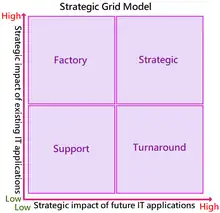 Strategic Grid Model is a contingency approach that can be used to determine the strategic relevance of IT to the organization. The model was proposed by F. Warren McFarlan and James L. McKenney in 1983, the model takes the impact of the information technology on the strategy in the future planning as the horizontal axis, and the current impact of the information technology on the corporate strategy as the vertical axis, which is divided into four types: Support, Turnaround, Factory, and Strategic.[1][2]