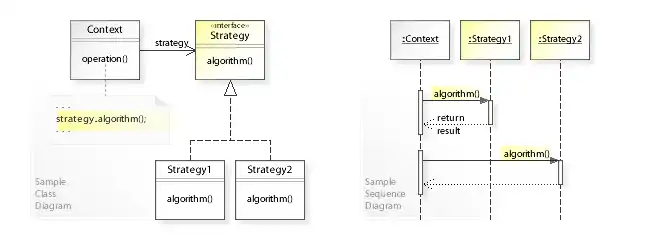 shows the run-time interactions: The Context object delegates an algorithm to different Strategy objects. First, Context calls algorithm() on a Strategy1 object,