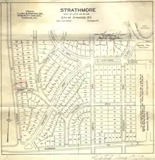 The subdivision was planned by 1917 and developed in 1919 by Clark & Porter, Inc. Marketing materials stated "...no smoke, no dirt, no fogs, no two-family or apartment houses, no business places of any kind, nothing but homes."[3] An extension of the middle class and upper middle class Summit Avenue residential neighborhood on the other side of Onondaga Park and Hiawatha Lake, Strathmore was marketed as "an exclusive residential district" when it officially opened on September 27, 1919. It attracted solidly middle class and upper middle class residents into various enclaves such as Robineau Road. The original advertisement flyer proclaimed "There can be no cheap homes in Strathmore by the Park", referring to Onondaga Park. Strathmore was zoned strictly residential, allowing for only single-family and two-family homes with a garage. It also contains many rental properties in the "less greater" section past Summit Ave.