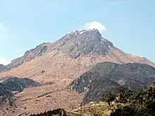 A stratovolcano, also known as a composite volcano, is a conical volcano built up by many layers (strata) of hardened lava and tephra.[1] Unlike shield volcanoes, stratovolcanoes are characterized by a steep profile with a summit crater and periodic intervals of explosive eruptions and effusive eruptions, although some have collapsed summit craters called calderas. The lava flowing from stratovolcanoes typically cools and hardens before spreading far, due to high viscosity. The magma forming this lava is often felsic, having high-to-intermediate levels of silica (as in rhyolite, dacite, or andesite), with lesser amounts of less-viscous mafic magma.[2] Extensive felsic lava flows are uncommon, but have travelled as far as 15 km (9 mi).[3]